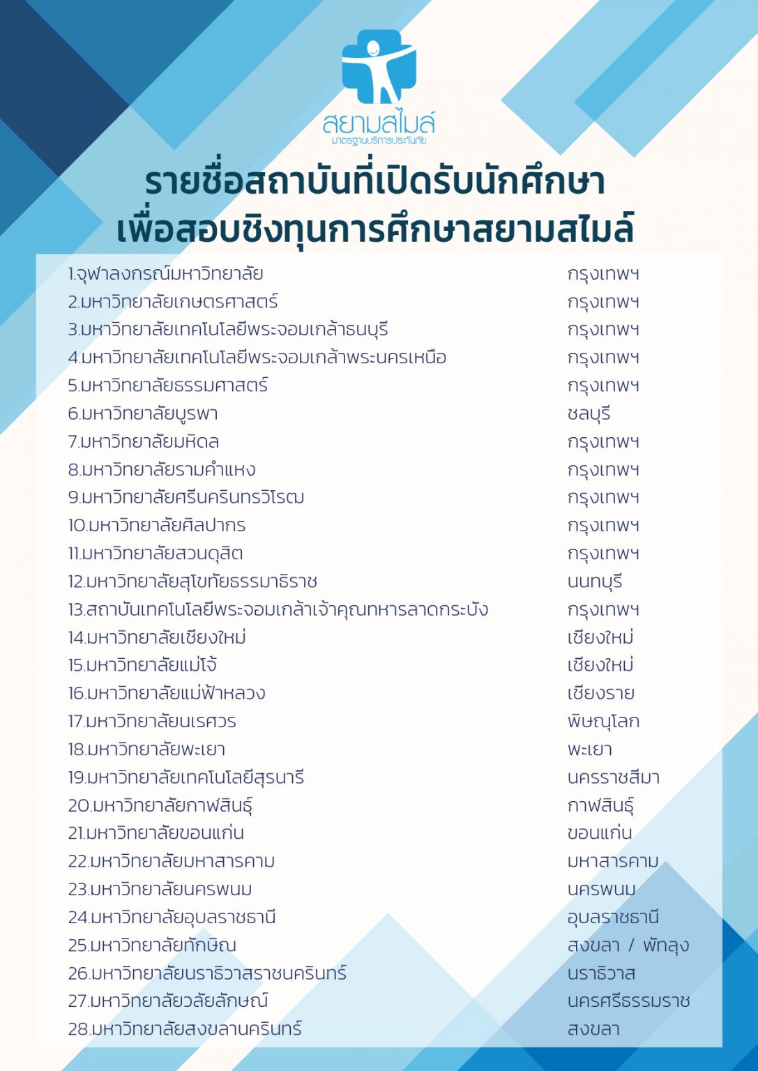 นักศึกษาที่มีผลการเรียนดี มีศักยภาพสูงและกำลังศึกษาอยู่ในระดับชั้นปีที่ 3 ขึ้นไป ทุกสาขาวิชา สยามสไมล์เปิดรับสมัครสอบชิงทุนการศึกษา สยามสไมล์ในระดับปริญญาตรี ปีการศึกษาละ 60,000 บาท ท่านสามารถตรวจสอบรายละเอียด การรับสมัคร และ สถาบันการศึกษา ที่เปิดรับสมัครเพื่อสอบชิงทุนการศึกษาสยามสไมล์ ได้ตามรายละเอียดดังต่อไปนี้